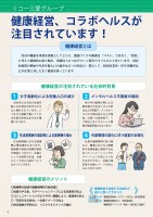 8健康経営、コラボヘルスが注目されています!リコー三愛グループ 社員の健康を重要な資源としてとらえ、健康づくりの推進を「コスト」ではなく、「投資」と考えて積極的に取り組み、業績向上につなげていく経営スタイルのことをいいます。国民医療費の増加や生産年齢人口の減少などへの対応の一環として、経済産業省・厚生労働省などが企業に対し大きく推進を図っています。健康経営とは健康経営が注目されている社会的背景健康経営のメリット 2060年には日本の生産年齢人口は現在の約半分になると推計されています。いつまでも健康で働いてくれる社員の存在はますます重要になります。 生活習慣病における医療費は増加傾向にあります。医療費の増加は保険料徴収の増加につながり、企業にとっては経営の圧迫、社員にとって収入の減少へとつながっていきます。 世の中の国際化等による競争激化や生活リズムの変化などが原因で、メンタルヘルスの不調を訴える人が増加。仕事への意欲低下、うつ病など多くのストレス障害の発症原因にもなります。 社員の健康管理に取り組むと、職場における人間関係や目標意識と関係する社内コミュニケーションやモチベーションの向上につながるだけでなく、社員の満足度や企業イメージの向上にもつながります。1 少子高齢化による労働人口の減少3 生活習慣病の増加等による医療費の増大2 メンタルヘルス不調者の増加4 外部環境の変化に伴う経営の合理化〇医療費の削減や健康保険料の負担減に〇社員のやる気、モチベーションアップによる生産性の向上〇コミュニケーションのとりやすい組織により、創造性の向上〇「元気のある会社」=企業イメージの向上〇労災事故の予防など、リスクマネジメントの強化《 健康経営を支援する仕組みが 続々と整ってきました 》大企業 「健康経営銘柄」「ホワイト500社」(経済産業省)中小企業 「健康経営優良法人」(経済産業省) 「健康経営アドバイザー制度」(東京商工会議所)